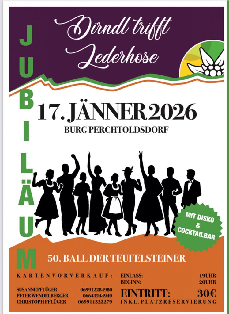 Aufgrund des großen Erfolgs wurde die Burg Perchtoldsdorf Austragungsort des nun genannten „Ball der Teufelsteiner“. Dort findet er bis heute statt und feiert am 17. Jänner 2026 sein 50-jähriges Jubiläum unter dem Motto „Dirndl trifft Lederhose“. Beginn 20.00 Uhr, Einlass 19.00 Uhr. Eintritt 30 € inkl. Platzreservierung. Karten und Infos unter 0699 1228 4980 (Susanne Pflüger) oder 0664 324 4949 (Peter Wendelberger)