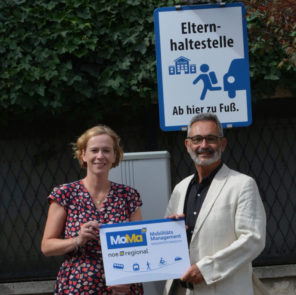 Wibke Strahl-Naderer von NÖ.Regional und Vizebürgermeister Anton Platt freuen sich über die neuen Elternhaltestellen in Perchtoldsdorf. Marktgemeinde Perchtoldsdorf / zVG