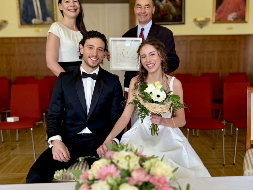 Brunn am Gebirge: Standesbeamtin Nina Zimmermann-Rößler hatte am ersten Trauungs-Samstag in der Geschichte von Brunn am Gebirge alle Hände voll zu tun. Nicht weniger als 12 Hochzeitspaare gaben sich im ehrwürdigen Sitzungssaal des Rathauses ihr Ja-Wort. Das allererste Brautpaar, das standesamtlich im Rathaus der Marktgemeinde Brunn am Gebirge getraut wurde, waren Alexander und seine Sara. „Wir wohnen zwar in Wien, sind aber von der südlichen Peripherie begeistert und wollten unbedingt