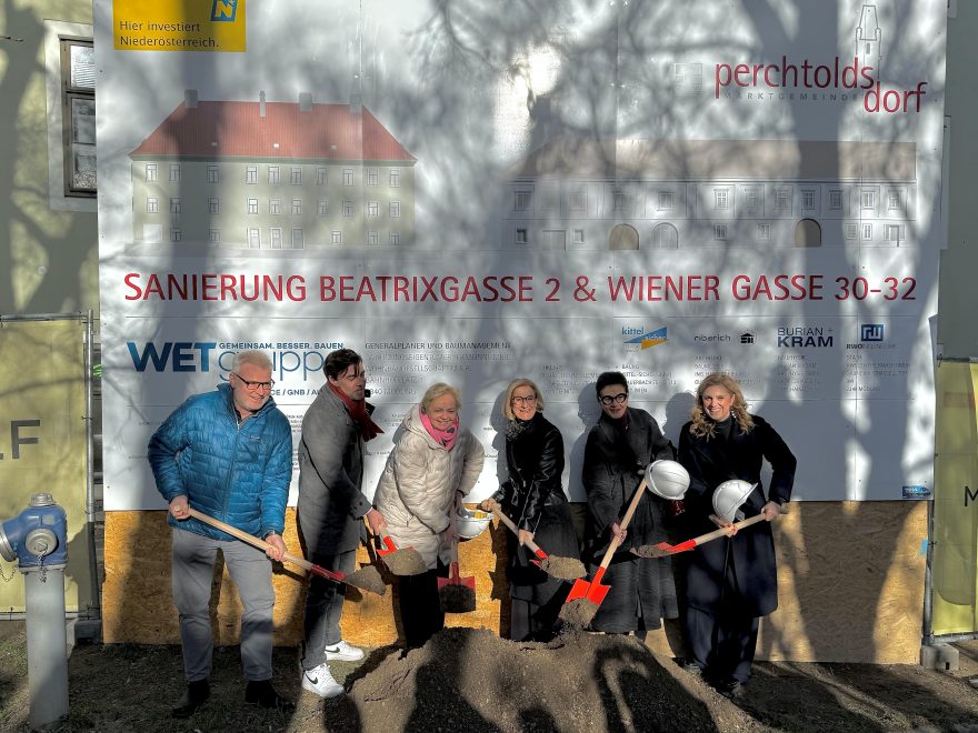 Perchtoldsdorf: Der Spatenstich zur thermischen Sanierung der beiden historischen Wohnhausanlagen Wiener Gasse 30-32 und Beatrixgasse 2 wurde am vergangenen Freitag, dem 13. Februar 2026, durch Landeshauptfrau Johanna Mikl-Leitner und Bürgermeisterin Andrea Kö vorgenommen. Die Wohnhäuser stehen im Eigentum der gemeindeeigenen Perchtoldsdorfer Immobilien GmbH und umfassen 28 Wohneinheiten mit einer Gesamtwohnnutzfläche von insgesamt etwa 1.740 Quadratmetern. Die Sanierung wird durch Mittel der NÖ Wohnbauförderung sowie des Bundes mit einer Gesamthöhe von