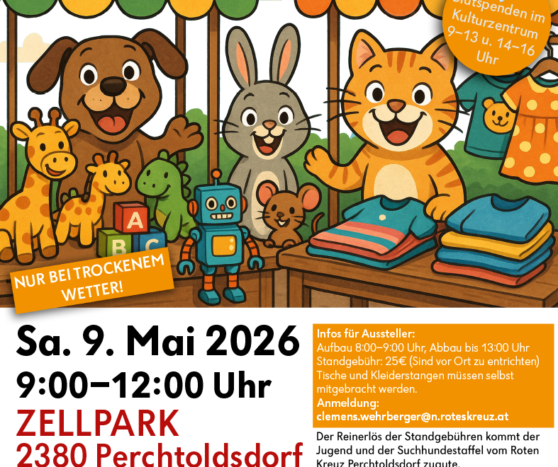 Am 9. Mai veranstaltet das Rote Kreuz Bezirk Mödling von 9.00 bis 12.00 Uhr im Zellpark in Perchtoldsdorf einen Flohmarkt für Kindersachen. Die Aussteller zahlen eine Gebühr von 25 Euro und können ihren Stand von 8.00 bis 9.00 Uhr aufbauen. Tische und Kleiderstangen müssen selbst mitgebracht werden. Anmeldung unter: clemens.wehrberger@roteskreuz.at. Der Reinerlös der Standgebühren kommt der Jugend und der Suchhundestaffel vom Roten Kreuz Perchtoldsdorf zugute.