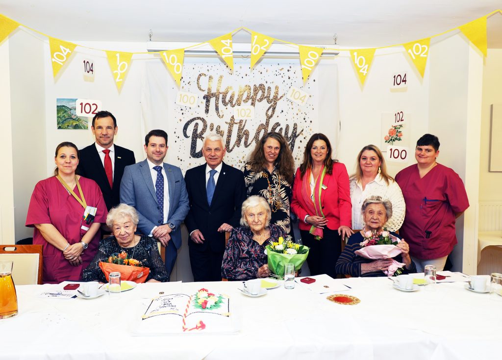 Alle vier Damen freuten sich über Glückwünsche, Geschenke und Blumen, die von Bürgermeister Johann Zeiner, Katharina Blaim von der Bezirkshauptmannschaft Mödling als Vertreter von Landeshauptfrau Johanna Mikl-Leitner, von Wiener Privatkliniken-Geschäftsführer Thomas Ebm, von Seniorenresidenz-Verwaltungsdirektor Thomas Bogendorfer, von Pflegedirektorin Claudia Götz und der Assistentin der Heimleitung, Manuela Hanler, überreicht wurden. Nach den Gratulationen plauderte man gemütlich bei einem Stückchen Torte.