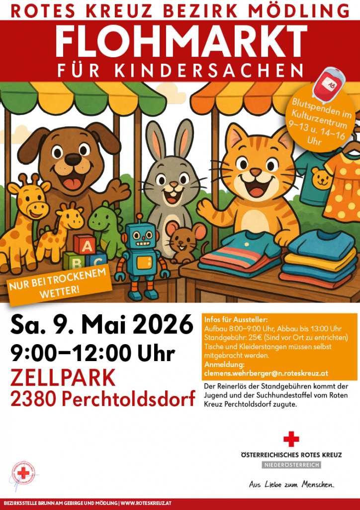 Am 9. Mai veranstaltet das Rote Kreuz Bezirk Mödling von 9.00 bis 12.00 Uhr im Zellpark in Perchtoldsdorf einen Flohmarkt für Kindersachen.