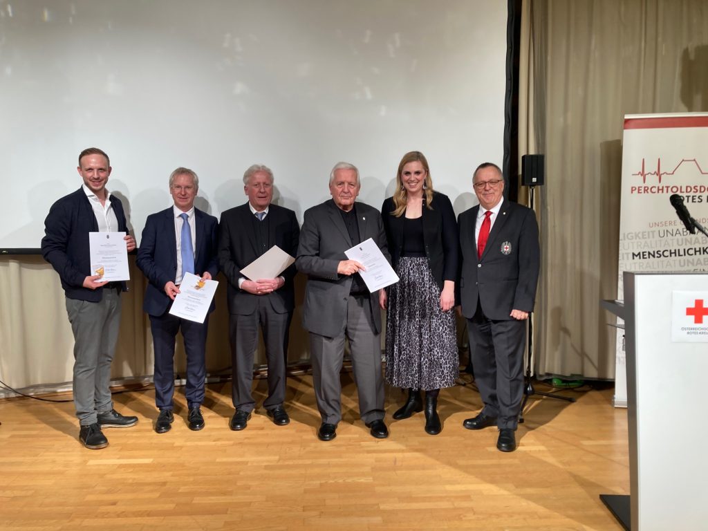 Geehrte Rot-Kreuz-Helfer, v.l.: Mag. Florian Mahler, Dr. Clemens Wehrberger, Ing. Herbert Lechner, Dieter Mayerhofer, Marlene LAbg. Zeidler-Beck und Ortsstellenleiter Robert Horacek