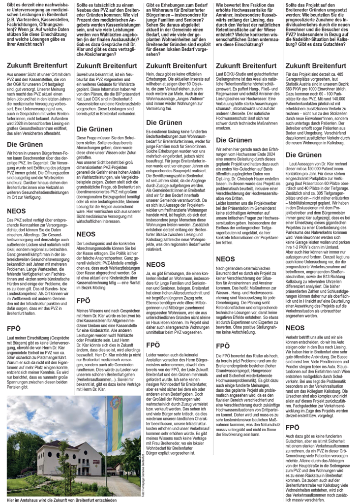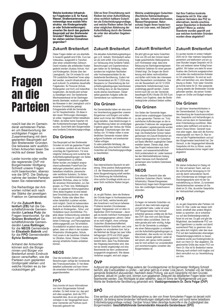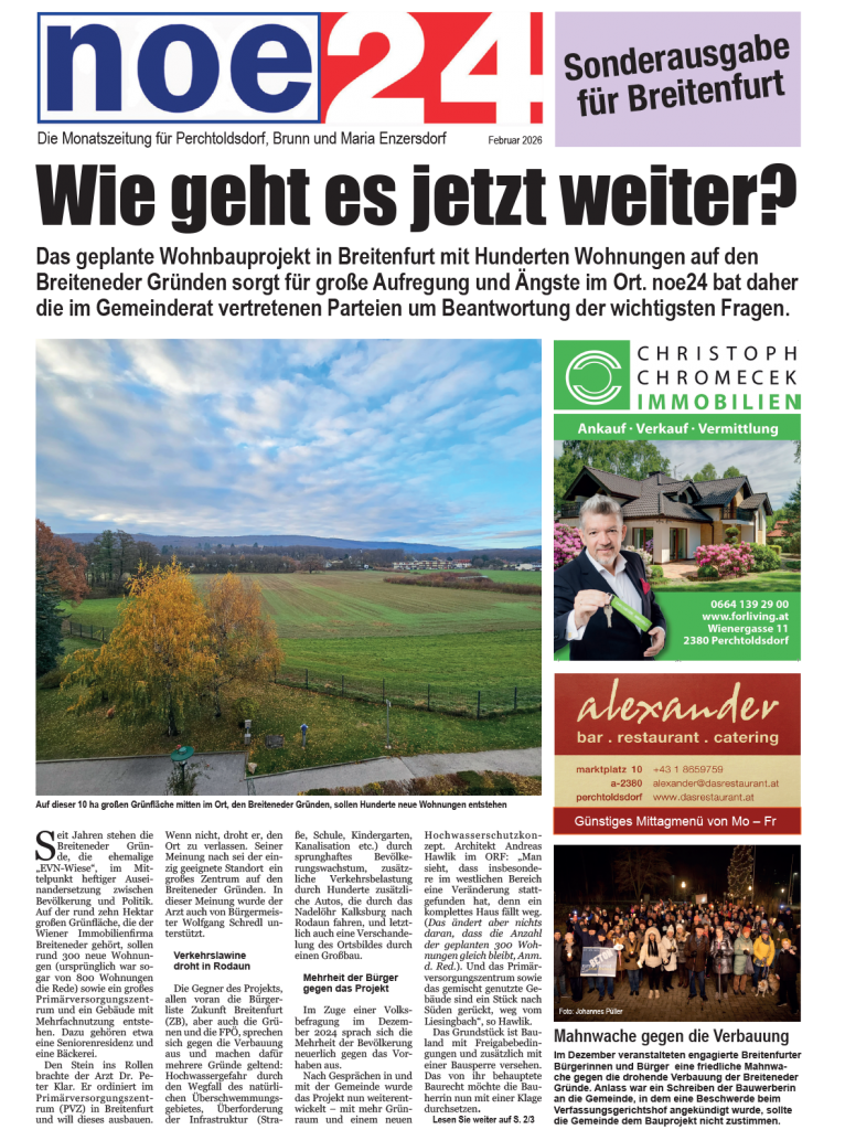 Breitenfurt: noe24 bat die Rathausparteien um Stellungnahme zu einem geplanten Großbauprojekt im Ort, wo auf einer Wiese 300 Wohnungen entstehen sollen. Die Stellungnahmen erschienen in einer Sonderausgabe von noe24 und wurden von der Post an die Haushalte verteilt.